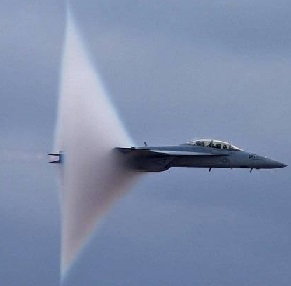 Ses hızı aşılırken süpersonik patlama sesi ve jet uçağın etrafında bulutsu meydana gelir.